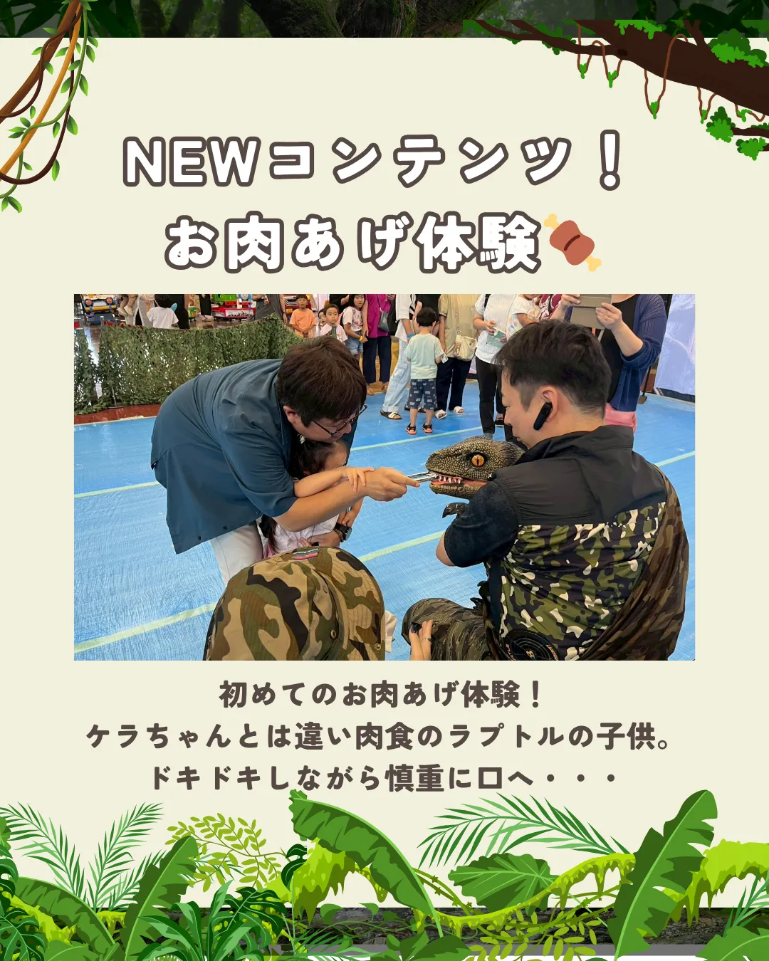 NEWコンテンツ「お肉あげ体験」では、ラプトルの子どもにドキドキしながらお肉をあげる子供たち🍖💕