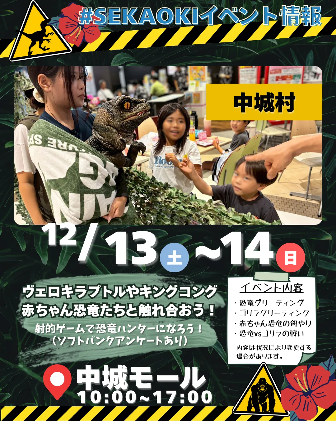 12/13(土)~14(日)は中城モールへヴェロキラプトルや赤ちゃん恐竜たちと触れ合える大人気イベント開催! シューティングゲームで“恐竜ハンター体験”もできちゃうよ 家族で楽しめる内容盛りだくさん!ぜひ…
