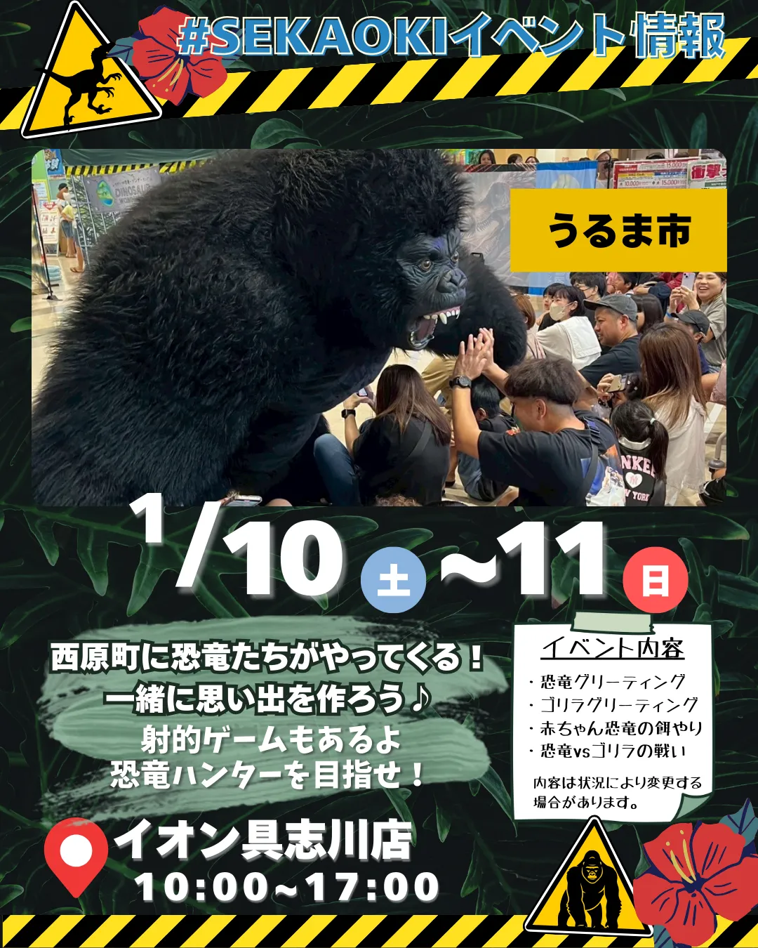 巨大ゴリラ出現注意週末、イオン具志川がジャングルに…!?恐竜&ゴリラが大集合のドキドキ体験型イベント開催迫力満点の恐竜グリーティングゴリラとの遭遇…!?赤ちゃん恐竜の餌やり体験恐竜vsゴリラの…